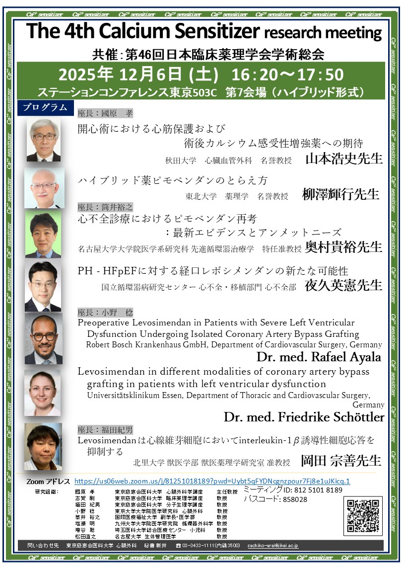 第46回日本臨床薬理学会学術総会と共催にて「The 4th Calcium Sensitizer research meeting」を開催いたします。
